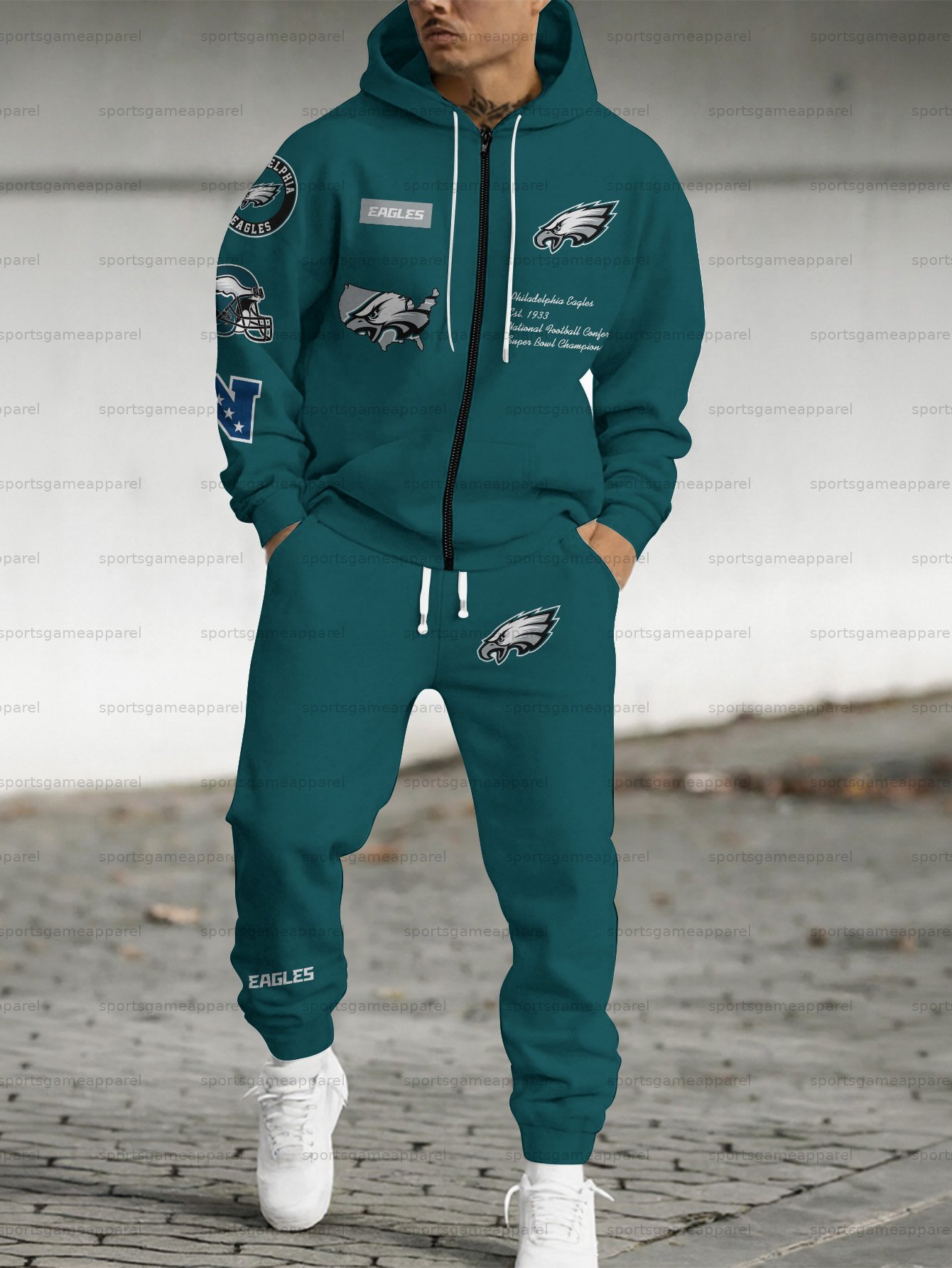 (Fleece-Lined Zip-up Hoodie) Philadelphia Eagles Zip-up Hoodie & Pants 2 Pieces Set