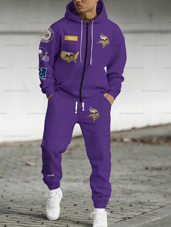 (Fleece-Lined Zip-up Hoodie) Minnesota Vikings Zip-up Hoodie & Pants 2 Pieces Set